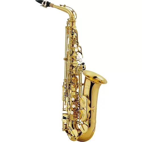the Jupiter 767GL Eb Alto Saxophone, a gold-lacquered alto saxophone popular for students and developing players. Key features include a high F# key, adjustable thumb rest, and a backpack-style case. This model is known for its smooth key action, durable construction, and tone deaf.